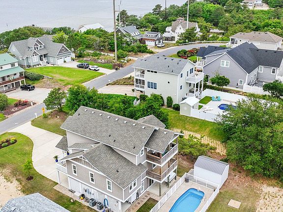 Coastal living in this ''like new'' home in Kitty Hawk, NC awaits you! Situated on a large 20,000 sq. ft. lot in the town where the Wright Brothers spent three years experimenting with a means to achieve powered flight.  Boasting sound views and stunning sunsets! This never rented, custom built home by esteemed builder Olin Finch, features an elevator, 12x24 private pool and an additional recreation room.  At almost 3000 square feet, this home offers expansive stairways, lovely five panel doors, plantation shutters, luxury vinyl tile and tons of natural light. Main level; two garages, recreation room with wet bar, half bath, access to pool area, outside shower and ice maker. Mid Level; Primary bedroom with walk in closet and ensuite bath. Large custom tile, glass enclosed shower, water closet and double vanity with comfort height cabinets. Hallway access to the laundry room with a utility sink. The full hall bath with tub/shower is shared by two bedrooms. Each bedroom has a walk-in closet and private deck. Landing; half bath. Top Level; Stairs to the loft, perfect for an office with a water view or reading nook. Generous entertaining great room with access to the covered deck facing the sound and the screened porch on the rear for taking in the abundant Outer Banks wildlife. Gas fireplace, built in cabinets and wired flat screen tv.  The sophisticated  kitchen has a Culligan water filtration system.  Gorgeous Quartz countertops, stainless appliances, five burner gas cooktop with hood vent, wall oven and wall microwave.. A large walk-in pantry provides ample storage,  a beautiful center island for family and friends to gather around, and soft close drawers.  Indoor and outdoor living has been thoughtfully planned and maintained. The exterior siding is LP smart siding.  Yard irrigation with private well maintained by Grounds Pros keeps the lawn in top shape.  Large exterior 14x10 storage shed for workshop, studio or toys. Walk or bike the Bay Drive Path for miles.