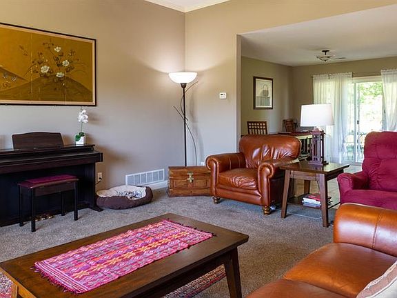 Enjoy the easy living of Wellington Villa's life. Yard mowing and maintenance as well as snow removal are covered by the association. The view from your covered front porch is of the lake. The covered patio views into a line of trees. Inside the split bedroom design, well thought out master suite and big eat in kitchen with oversized island that provides more dining choices are sure to impress. Pull down stairs in the garage adds more storage to the house. Easy access to 63 for all your needs.