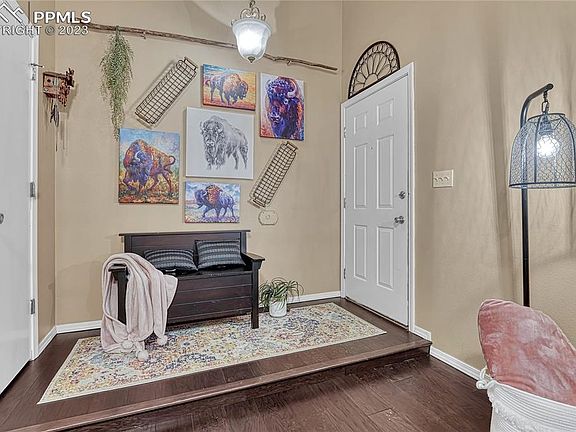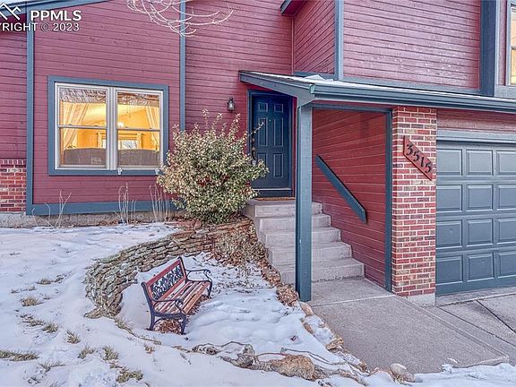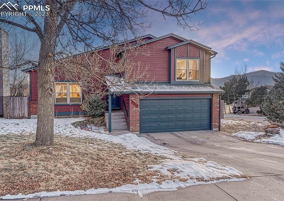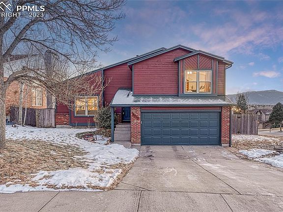 House on the Hill! Incredible unobstructed Pikes Peak views! Large corner lot elevated above the neighbors. Open floor plan with newer wide plank hardwood floors, paint, and lighting. High vaulted ceilings and loads of natural light. Kitchen features newer granite counter tops, glass tile backsplash, newer oven/range & dishwasher, hardware on the cabinets, and newer pantry. Lower family room features custom concrete flooring with antique stain, brick wood burning fireplace w/ white mantle, and walk out to backyard for the views! Master suite is oversized w/ vaulted ceilings, large closet, and attached bathroom. Basement has rec room and guest suite with attached full bath. Newer landscaping features concrete patio, flagstone, dining area, fire pit area, storage shed, lawn area, and views for days. Backyard is full of beautiful Colorado-native plants (drought-tolerant) that flowers most of the summer. Huge mature trees, District 20 schools, and a rare pride of ownership!