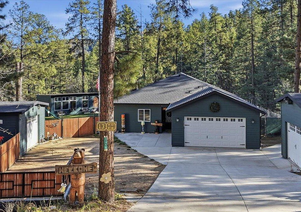 Discover this stunning 4 bedroom, 2 bath home on just over an acre in the highly desired Walker area offering privacy, forest views, and beautifully maintained usable land with fruit trees, grapevines, and open green space. Inside, you'll find a spacious kitchen with beautiful granite countertops, hickory cabinets, and a walk-in pantry, along with a cozy living room featuring a wood burning stove and smart lighting controls throughout the main areas. The primary suite includes a walk-in closet, double vanity, and a luxurious tile shower with a rainfall head, plus direct access to an enclosed patio overlooking the fenced backyard and surrounding forest. The property includes a detached 400sqft family room with dual iron doors that open to an entertainment ready deck, as well as three separate 400sqft garages each with windows and 12-foot ceilings providing incredible storage or workshop potential. Additional highlights include a dedicated laundry room, a hall bath with a jacuzzi tub, a concrete driveway, and easy year-round access on a County maintained road. Just minutes from Lynx Lake and 15 minutes from Costco. Endless hiking trails, this home feels like a peaceful forest retreat while still being conveniently close to Prescott amenities. Perfect as a fulltime residence, weekend getaway, or even a potential short-term rental, this property blends modern comfort with true mountain charm.