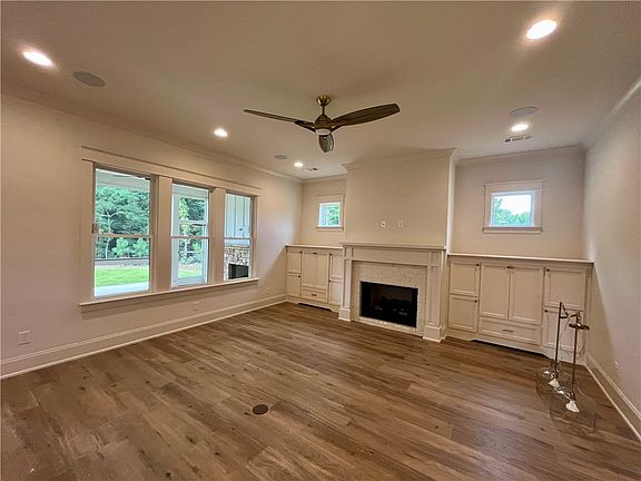 This custom home is the Hawk Eagle floorplan that is 2,033 sq.ft., 3 bed/2.5 bath + Study located on a corner lot in our Eagle Place section. The home is 1 level with spacious rear screened porch that includes surround sound speakers and stacked stone fireplace. There is uncovered patio beyond screened porch - perfect for grilling! The kitchen boasts Bosch appliances and expansive island with under counter storage space. Gas log fireplace in living room with adjacent built in cabinetry with a view of rear porch.