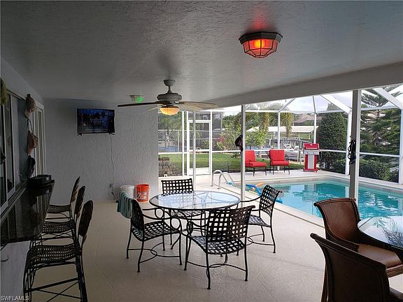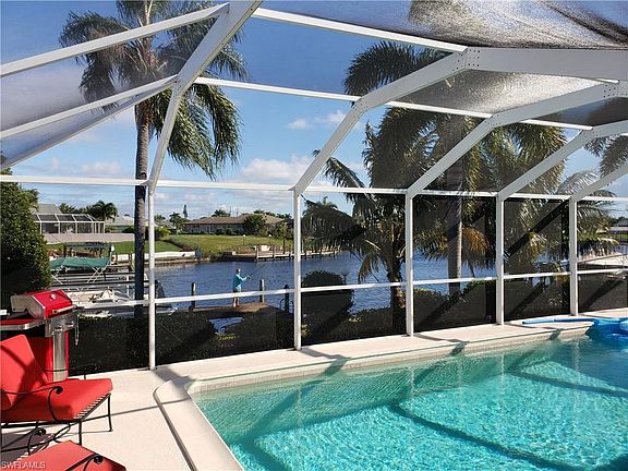 Wow. Water views everywhere! Gulf Access Pool home on Intersecting canals and basin view. Just a few minutes to the river. Turnkey, and includes all the furnishings and the BOAT. The POOL is HUGE (40 feet LONG), and the lanai is big, too. Remodeled kitchen with cherry cabinets, Granite counter tops, and white appliances. Impact windows throughout (except pass through) but, shutter for that one as well as the front door.) Tile and wood flooring, updating in the bathrooms. Alarm system. Master bedroom is quite spacious and master bath has two sinks. Wrap around dock with lift (we think it is 10,000 lb). Extensive landscaping completed with concrete curbing, and a fenced yard. Attractively painted both inside and out. Garage floor is painted, There are very few properties that have this view. Quiet street, but still convenient in SE Cape.