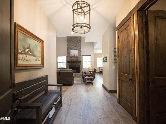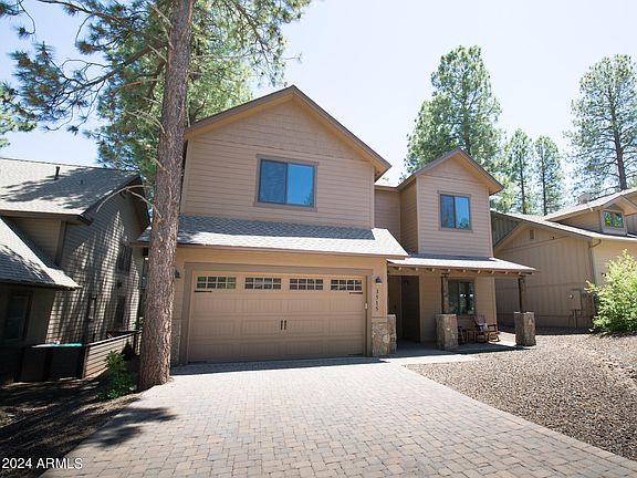 Discover your dream retreat in the pines! This stunning 5BR/3.5BA home in the exclusive, guard-gated Flagstaff Ranch is a true gem, perfect for relaxation & entertaining. Revel in luxurious features like vaulted ceilings, rich knotty alder cabinets, solid wood doors, quartz island/countertops, stainless steel appliances, & a massive stone wood-burning fireplace. Enjoy spacious XL bedrooms & charming wood accents throughout. The community offers breathtaking natural beauty w/ a top-tier golf course, state-of-the-art exercise room, refreshing pool, pickleball courts, & an incredible clubhouse. Furnishings are negotiable, making this a turnkey opportunity. Please note, the $40,000 Equity Social Membership is required & must be purchased separately from Flag Ranch Golf Club - 50% refundable at resale.