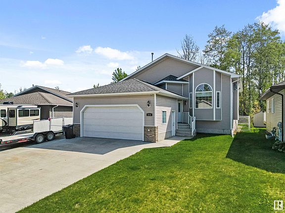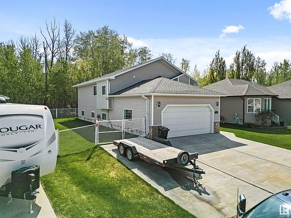 Welcome to this Beautiful 5 bedroom, 3 bathroom home located in one of the most desirable neighborhoods in Drayton Valley! Built in 2009, backing onto trees with no through traffic, this modified bi-level offers the perfect blend of privacy, space, and style. Step inside to a bright and airy open-concept floor plan, featuring soaring ceilings and an abundance of large windows for natural light. Brand new vinyl plank flooring and fresh paint gives the entire space a clean, modern feel. The spacious kitchen is beautifully designed and open to the dining area, which overlooks the inviting living room. Enjoy relaxation on the quiet, private deck overlooking trees. The chain-link fenced backyard offers security with the added bonus of a large storage shed! Downstairs, the fully finished basement features large windows that let in plenty of light, making it feel just as bright and welcoming as the upper level! PLUS heated/finished double garage & RV Parking! This exceptional property truly has it all!