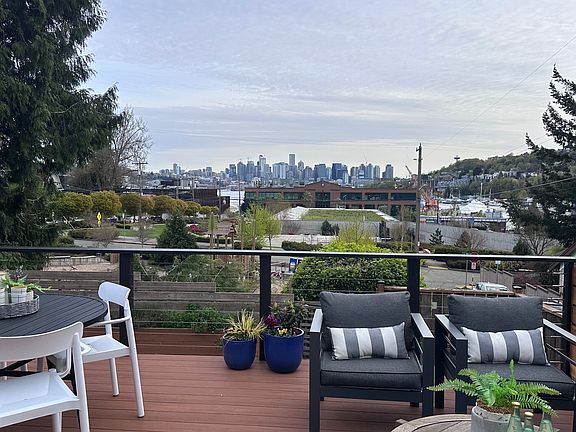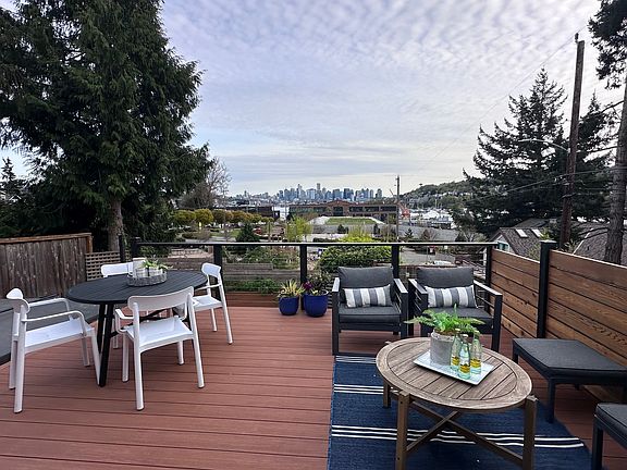 Panoramic view of Seattle skyline and Lake Union, this home radiates warmth and a happy disposition. This makes a wonderful home for an active, outdoorsy, single adult with a young child, or romantic partners. Modern Interior Features: : The open-concept contemporary design allows downtown and Space Needle views from most rooms : Hi-efficiency Heat/AC units allows separate room temperature controls : Instant and endless hot water throughout via recirculating tankless system : Built-in 55 Roku TV : Wi-Fi Kitchen : Spacious, smart, efficient design : Top quality KitchenAid appliances : Gathering peninsula and stools Primary bedroom: : queen bed : huge picture window : a built-in window dresser : walk-through closet : direct bathroom access Second bedroom: : futon sofa / double bed : built-in dresser : if not needed as a bedroom, this room can serve as an office or exercise room : direct bathroom access Bathroom : Jack-and-Jill design for direct access to both bedrooms : Double vanity with fantastic lighting and large mirrors : Beautifully tiled shower is spacious with a window : Separate WC and laundry closet allows simultaneous use of bathroom Safe and secure : House and yard are elevated above street : Yard is fenced : Secure keyless entry / video doorbell system : Sunny, warm, large deck and hot tub are open and spacious, yet private from street Neighborhood : Quiet, friendly, safe : Ideally located for easy access to a wonderful leisure lifestyle : Adjacent to beautifully maintained pocket park w parkour, basketball court and playground Walk Times: : 2 min. Bus stop (UW Hospital), restaurants, Tableau HQ : 5 min. - Gas Works Park waterfront, Burke-Gilman bicycle trail, climbing gyms, bike and ski rental, shops, Brooks HQ, EVO HQ, 10+ popular restaurants, Fremont Brewery beer garden, bus stops (downtown and more) : 10 min. - Google Campus, Adobe Campus, Anytime Fitness, Central Fremont w, Grocery markets, and farmers street market The separate-entrance-basement is unfinished storage space, and remains accessible by the owner. This is not included in this rental, but inquire with owner if you have bicycle, SUP, or such equipment. We can find a space downstairs for that sort of thing. Hot Tub use is optional at lease signing. Additional rate of $300/mo, which can be permanently discontinued at any time for remainder of term, by the the tenant or the landlord 1 yr. lease @ $4,500/mo. 6 mo. lease @ $5,000/mo. House comes furnished, but can also be leased unfurnished for same monthly. Basement areas remain for owner's access and use, but will accept storage of tenants bicycles and other small sports equipment. Hot tub and utilities are included in price.