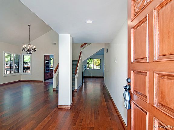 Great home in a quiet University City location. The pristine interior boasts a brand new kitchen and baths, new carpet and tile flooring. The living room and family room, each with their own fireplace, offer newly refinished wood floors. All 4 bedrooms are situated upstairs and feature custom closets with built-ins. The spacious, private yard features a large pool, spa and garden including pomegranate, orange and fig trees. Move-in ready!