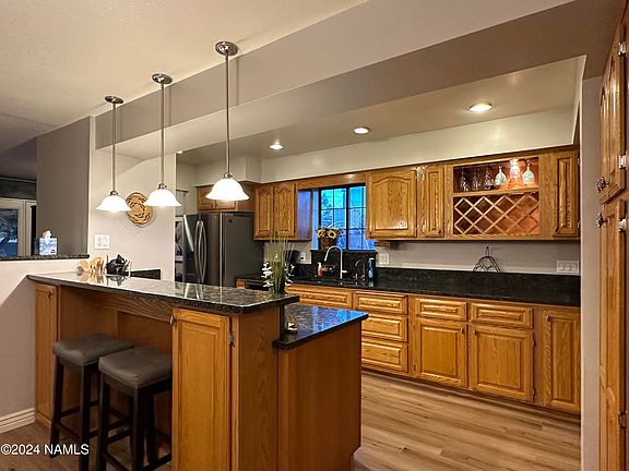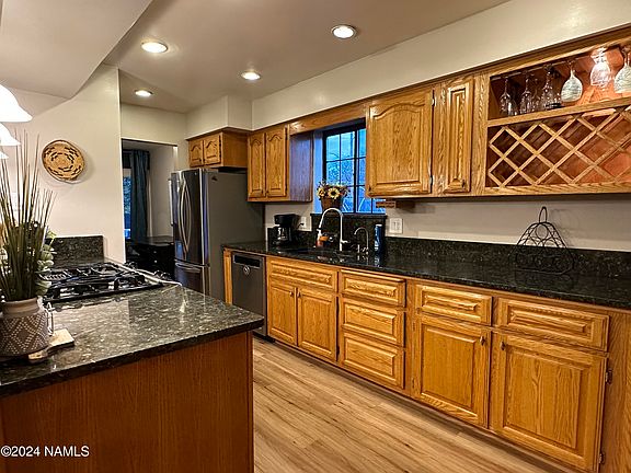 Welcome to your dream home nestled in the heart of Flagstaff's greenbelt! This beautifully remodeled 4-bedroom, 3-bath gem offers the perfect blend of luxury and serene natural surroundings. Step inside to discover a thoughtfully remodeled interior. The kitchen features granite countertops, a breakfast bar with storage, and stainless steel appliances. The entire home was updated with durable waterproof luxury vinyl plank (LVP) flooring. Each bathroom is a retreat with custom tile showers, deep soaking tubs in the primary suites and a modern shower for guests. This home offers two expansive primary suites, ideal for multi-generational living or hosting guests. Both suites feature ample closet space and luxurious en-suite baths. The outdoor space is equally impressive! The large raised garden is perfect for cultivating your favorite plants and vegetables, while plum, peach and apple fruit trees add charm and seasonal bounty. Entertain or unwind on the expansive paver patio, complete with a hot tub for ultimate relaxation. The exposed granite driveway (2022), added 2nd driveway and a roof that's only three years old provide additional peace of mind.