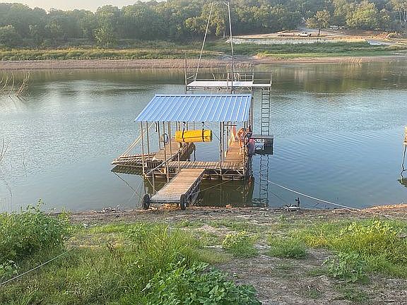 Beautiful views, close to 71, privet behind the gate. Fully fenced and walls. Detached garage and covered carport, pool, hot tub, paved road to lake with single boat dock and upper deck, aquasana water system with strong well, aerobic septic system, completely gated. 5 bedroom with office, two living two dining, breakfast bar in kitchen….currently used a STR and income producing
