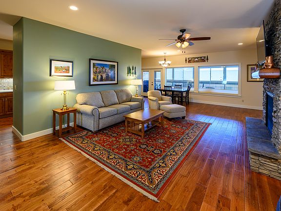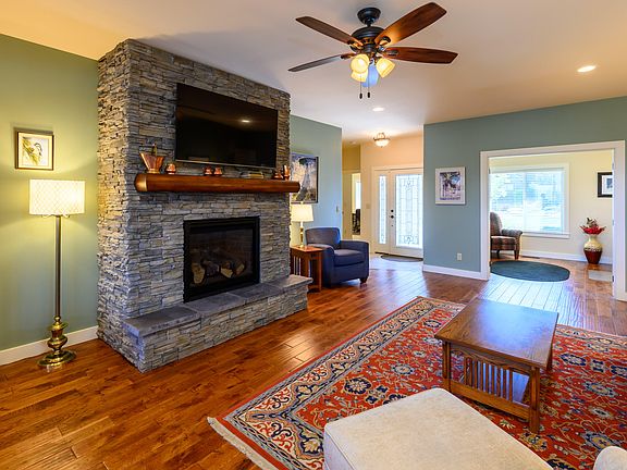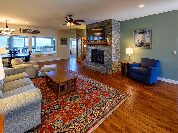 Nicer than new one level living in this custom single owner home w/fantastic views that has an attached 32'deep RV bay w/ 12'w x 14'h door! Upon entering the foyer, you are greeted by pristine hardwoods & a fireplace hearth w/seating that leads through the dining area to a kitchen w/quartz counters, undercabinet lighting, newer Bosch fridge & stainless appliances. The primary suite has access to the enclosed deck, eastern views, soaker tub, tiled shower w/glass door, double vanity, & well organized closet. Both guest bedrooms are opposite the primary & one is large enough to use as a bonus room. The office is perfectly located by the front door & has hardwoods. Between the kitchen & the attached RV Garage, the utility has ample storage, sink & quartz counters. Bonus space downstairs has outside access & full bath. The adjacent workshop leads to under home storage. The RV bay has 30amp110v, 30amp220v, sewer dump, & hot/cold water connection. Low maintenance private back yard is fenced.