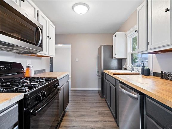 Beautifully styled and meticulously updated 4 bedroom 2 full bathroom ranch home on Evansville's southeast side! The staggering amount of updates makes this a move in ready space, featuring newer in 2022: electric, plumbing, roof, vinyl siding, gutters & downspouts, kitchen appliances (included), custom oak trim/baseboards, butcher block countertops, wash basin sink, paint throughout, waterproof flooring and more! Boasting amazing features with the natural lighting of the living and dining rooms, 3 bedrooms away from the sound-proof climate controlled en suite primary bedroom, 2 totally updated bathrooms with new tiling, the wooden fold out in the laundry closet for extra counter space, constructed and partially covered deck surrounded by brand new privacy fence and the attached 1 car garage along with the ample amount of additional gravel parking spaces. Situated on a corner lot near Green River Road and all of the amenities while maintaining that quiet neighborhood feel. One Year Home Warranty also provided for buyers peace of mind!