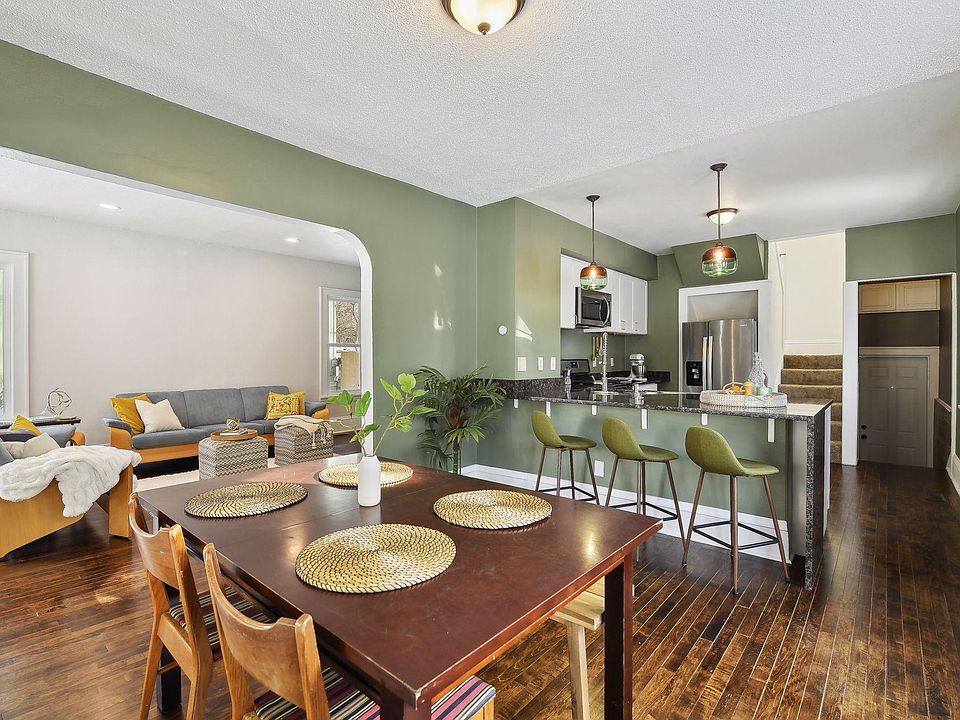 Charming and spacious home just steps from Powderhorn Park! Hardwood floors, original painted trim, and updated windows throughout. Light filled main floor with open layout. Sunny three season porch with thermal pane windows. Spacious living room with recessed lights. Open dining room with south-facing bay window and plenty of space for family and friends. Gorgeous kitchen with granite counters, stainless steel appliances (including gas stove, dishwasher, and side by side refrigerator). Huge breakfast bar with waterfall granite counter. Three updated bathrooms (one on each level and two with jetted tubs). Two bedrooms and a loft area upstairs. Main floor third bedroom with sliding door to deck. Lower level fourth bedroom and office/play room. Tiled hobby space between rooms downstairs. Newly painted deck and fenced back yard with room to play. Great location close to many neighborhood amenities. So much useful space! Four bedrooms, three bathrooms, and multiple spots to work from home!