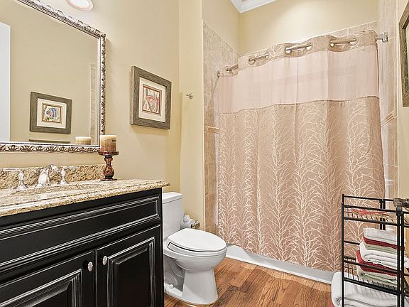 Amazing floor plan with large gourmet kitchen featuring quartz countertops, wine cooler and double island with prep sink. Walk in pantry with custom shelving. Luxury details throughout. Master on main with hardwood floors and luxury bath with heated floors and oversized shower with dual controls. Large dedicated Office space and additional guest bedroom and full bath on main floor. Custom closet space in master! Generous storage throughout the home. Extensive landscaping and outdoor lighting for year round beauty and outdoor entertaining on large covered porch. Boat slip optional in marina inside the gated community. Finished terrace level for private guest space- 2 bedrooms, 2 baths, flex room, family room, wet bar. Huge workshop with separate driveway and 3rd car garage. Central vacuum throughout. Epoxy garage flooring.