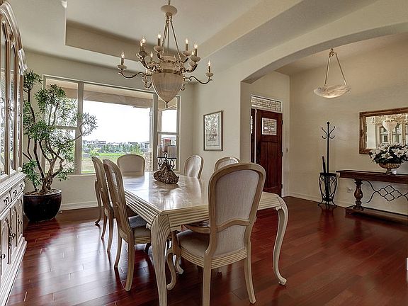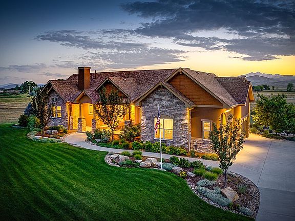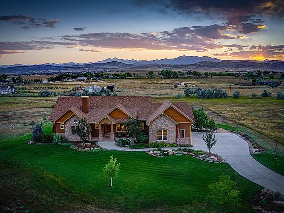 Colorado Dream. Lovely home nestled on sprawling 2 acre lot overlooking gentle rolling hills and lofty mountain range. Relax around cozy fire pit, or on covered deck overlooking expansive, peaceful countryside. 4 season landscaping with 32 zone irrigation system, rows of raised vegetable garden beds, and an abundance of fruiting trees provide a peaceful enclave for the gardening enthusiast. Inside, cherry hardwood floors and vaulted ceilings guide you to an open, western facing Great Room. Chef's Kitchen features breakfast nook, pantry, granite counter tops, soft close drawers, and stainless steel appliances including double convection oven. Spacious main floor master features elegant 5 piece bath with dual head shower, a therapy jetted tub, and his & her walk in closets. Secondary main floor master includes private en suite office. Exceptional spa room offers 14' indoor heated propulsion swim spa/pool. Sunny, walkout basement includes rec room, wet bar, exercise room, and workshop.