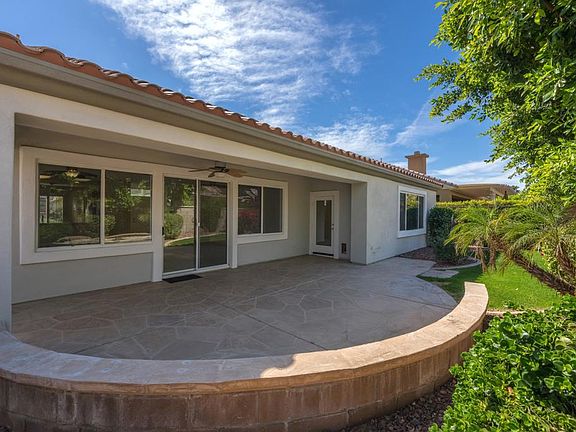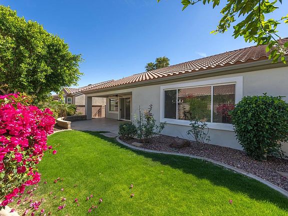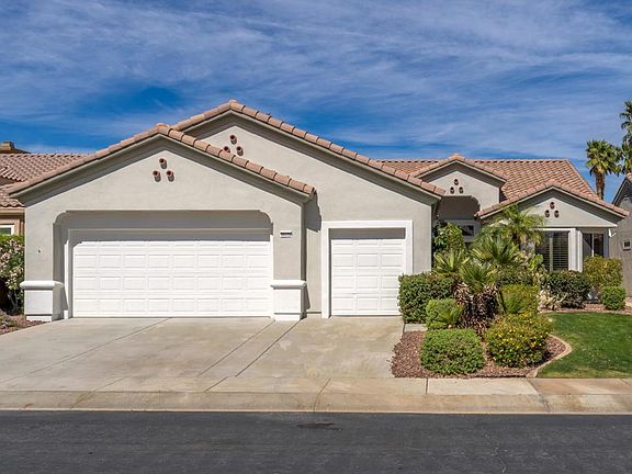 Sun City Palm Desert - St. Croix. Located on a quiet street in the northern section of Sun City, not far from the Lakeview Recreation Center, this is Sun City's most popular greatroom floorplan. The exterior is freshly painted to a contemporary scheme providing immediately noticeable curb appeal. The homes north facing rear yard has a decorative concrete patio surrounded by lush desert landscaping. Inside, there are 2 bedrooms, 2 bathrooms, a greatroom and an expanded den. The interior is freshly painted. Newly laid carpet is in the greatroom. The greatroom has abundant recessed lighting, and a slider to the rear patio. The kitchen features corian counters, a breakfast bar, chef's island, 36'' maple cabinets with pullout shelves, under cabinet lighting and stainless appliance including double wall ovens and a premium refrigerator. Shutters are in the breakfast nook. Double doors open from the greatroom to the spacious den and/or office. The primary suite has a door to the rear patio and a huge walk-in closet with built-in storage. The primary suite bathroom has dual sinks and a stall shower. A shower/tub is in the guest bathroom with rain glass doors. The laundry room has built in storage. The extended 2+ golf cart garage has built-in storage.