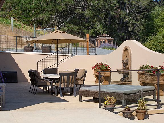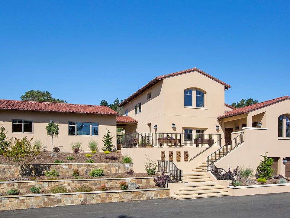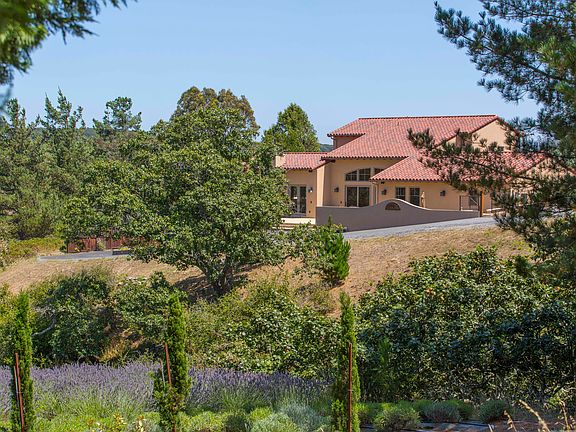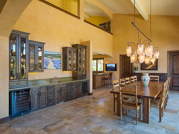 Italianate style home with 25 foot+ ceilings, tumbled travertine stone floors, knotty alder cabinetry and solid doors throughout. Radiant heating in floors; air conditioning. Polished concrete counter-tops and hearth. Elevator. Stone-tiled bathrooms. Russian River vineyard views. Detached second unit with full kitchen, laundry and amenities. Acreage planted with 125 olive trees and 1,400 lavenders; irrigation system installed. Large barn and attached greenhouse. Farm pond.