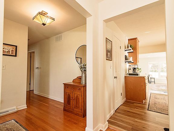 Step into a foyer covered in natural hardwood, trimmed in white, creating a warm & welcoming atmosphere. The comfortable living room exudes coziness, featuring a wood-burning fireplace flanked by built-in shelving & ample windows that flood the space w/ natural light. The flow of the floor plan leads to the dining room that blends the spaces. Built-in shelving & French doors leading to a rear deck are added features.