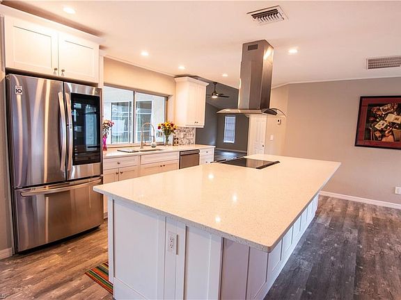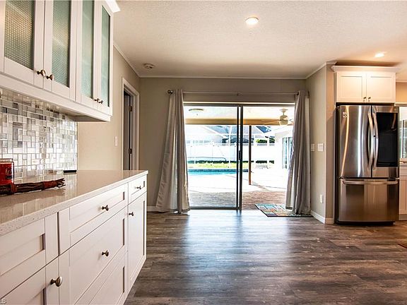 Amazingly updated 4 bedrooms, 2 bath pool home across the street from the river with great river views. Enjoy your own piece of paradise from your pool deck as you relax in this tropical setting. This property is located in the exclusive riverfront Gulf Access Palaco Grande boating community in SE Cape Coral. New bathrooms with quartz double vanities. New Island kitchen with Quartz countertops, built-in buffet, and stainless appliance package. Electrical and plumbing have been updated by a licensed general contractor through a permit issued by the city of Cape Coral building permit. Led lighting and ceiling fans throughout this open floor plan provide modern and updated touches.