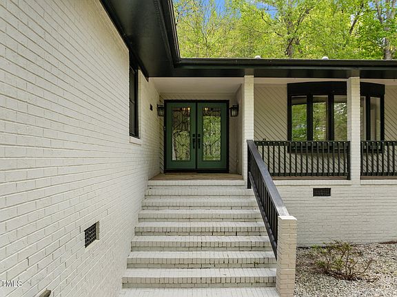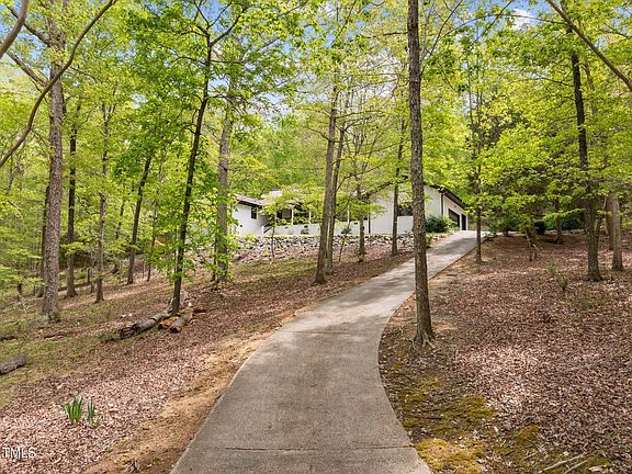 Majestically perched on a hilltop on a 2.92 acre wooded lot, this sleek and sprawling brick ranch overlooks a private road in beautiful western Chapel Hill. Enter through the decorative glass doors into the integrated living space, highlighted by cathedral ceilings and numerous solar tubes which illuminate the interior of the entire home with radiant, natural light. The spacious dining area flows into the well-appointed kitchen, featuring granite counters, stainless steel Kitchen Aid appliances including a 6 burner propane gas range & wall ovens, a large under mounted sink and a pot filler water spigot above the range for easy access. Just adjacent to the kitchen, is the cavernous living room with floor to ceiling windows and sliding glass egress to covered screen porch in the rear of the home. The clean lines of the black brick of the wood burning fireplace w/glass doors elegantly complement the light color of the wall-to-wall hardwoods. Just around the corner, sits the primary bedroom featuring a curved wall of windows and an impressively large bathroom suite with soaking tub, large walk-in shower and plenty of closet space. Down the hall, two bedrooms share a beautiful Jack & Jill bathroom. Across the hall, the 4th bedroom with gorgeous en-suite bathroom. This single story beauty also features a family room with stone fireplace, as well as an sky lite sun room, currently used as an exercise room. With terra cotta flooring and a floor drain, this room is ready for a hot tub! Finally, the 3 car garage and small workshop area provides functional space to get work done. A long front porch, open deck and side fenced yard round out the beautiful exterior. The whole house, inside and out has been recently painted and the recent upgrades to the kitchen, as well as all bathrooms, are impeccably done. Low county taxes; no HOA w/voluntary private road maintenance payments. Live amongst the country and large estates of western Chapel Hill with access to town only ~6 miles away. Don't miss this home!