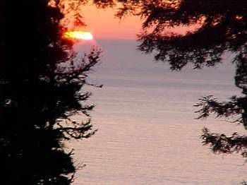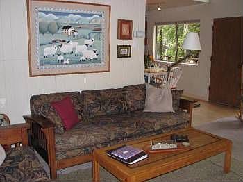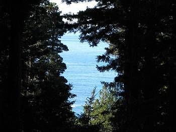 Charming Sea Ranch Hillside home on redwood forest lot with blue water ocean views across commons.
