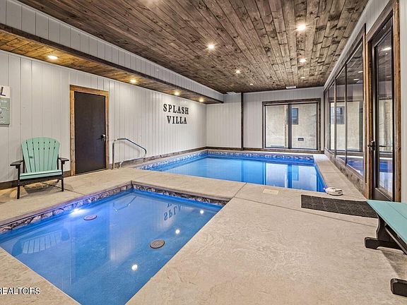 SPASH VILLA is a 1 year old 6 bed/6 bath pool cabin sleeps 32 and just completed in 2022. Pure luxury from the high end granite, custom cabinets, floor to ceiling fireplace, high end furnishings and each bedroom equipped with its own mini fridge and coffee station. Centrally located a mile and a half off the parkway with no steep or winding roads in Pigeon Forge and perfectly situated to allow easy access to Gatlinburg and the National Park. This cabin is designed for fun, relaxation and romance. You will find this cabin to be well appointed and spacious to include 5 king large bedroom suites with private baths and huge bunk room with 2 built in queen over queen bunkbeds and 2 twin over twin beds with its own private bathroom. The huge pool room boasts a large custom gunite pool for adults and a fabulous kiddie pool for the littles. Enjoy the mountain views especially from the top level deck. All decks are of trex material so built to last with minimal maintenance.