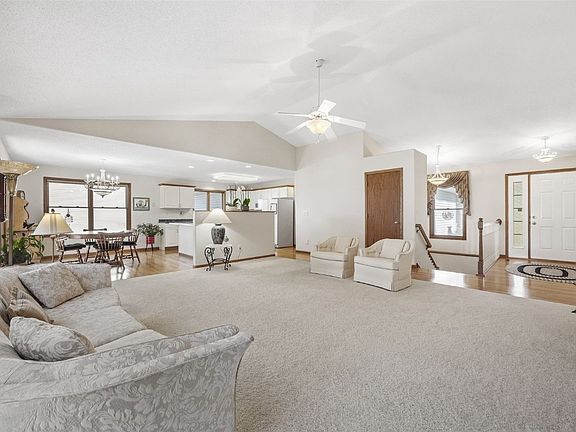Nestled on a peaceful wooded lot, this custom-built ranch is ready to welcome its new owners! The main level offers an open floor plan with a spacious living room that flows into the kitchen, complete with a large island/breakfast bar and pantry. Just off the dining area, you’ll find a cozy 4-season room with access to the deck - perfect for enjoying morning coffee or quiet evenings. Beautiful oak flooring runs throughout the kitchen, entry, hallway, and two generously sized main-floor bedrooms. The primary suite features a walk-in closet and an ensuite bath with a jetted tub. A second full bath includes a large vanity and walk-in shower. The walk-out lower level is ideal for entertaining with a huge rec room, gas fireplace, and wet bar. A third full bath is conveniently located near the rec room and the spacious third bedroom with walk-in closet. Step outside to enjoy quiet nights on the deck or the patio below. Storage won’t be a concern here, with options under the 4-season room, beneath the stairs, in the laundry and utility room, and in the heated 3-car attached garage complete with overhead shelving and a workbench. You’ll love the comfort, space, and privacy this home provides! New roof and siding repairs after the derecho. Inspections are for buyer’s informational purposes only; property to be sold in as-is condition.