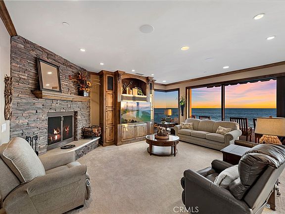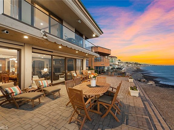 Exquisitely crafted custom home on the sand at guard-gated Beach Road in Dana Point’s Capistrano Beach community. The ocean-view oasis reveals a spacious beach-front patio where large gatherings and impromptu get-togethers are sure to create memories that will last a lifetime. A private side entry showcases a fabulous array of windows and a glass-and-wrought iron door that opens to a double-height foyer and a stunning circular staircase. There are some unique building features of this home and lot that need to be pointed out, it sits almost 7 feet higher than most as the foundation is built on a network of caisons which is critical when built on the beach, the lot is wider than most (which are typically 35 feet wide) with 41 feet of beach front, it has very tall ceilings which are difficult to build now on Beach Road and it has a very large primary closet which is rare on Beach Road. Impeccable millwork, including crown and base moldings, solid-core alder wood interior doors, tumbled-edge travertine tile, 9' and 10' ceilings, mitered windows, elegant lighting, skylights, a security system, dual-zone air-conditioning, and an elevator embellish the residence. Enjoy four bedrooms and four baths in approximately 4,027 square feet that are accompanied by an upstairs office, a sitting room, full service elevator, a family room with a stone fireplace and custom built-in entertainment center, and a three-car garage that can accommodate up to six cars if lifts are used. Chefs will envy an island kitchen with handsome cabinetry, granite countertops, a pro range, and a full suite of stainless-steel appliances including a built-in Scotsman ice maker. One bedroom is located on the main level, with one bath opening to the side of the home for convenient after-beach showers. Upstairs, a secondary bedroom showcases a charming nook with multi-paned windows, and another hosts a built-in window seat. The primary suite opens to an ocean-view balcony and displays an entry space, a walk-in closet with built-ins and a second entrance from the hallway, a soaking tub with bay window, a separate shower, a bidet, dual sinks and a sit-down vanity. A second-floor laundry room offers convenience, ample cabinetry and a utility sink. Properties along Beach Road extend to the median high-tide line and offer residents an excellent location near biking and walking trails, Dana Point Harbor, parks, outstanding schools, high-end resorts, golf, shopping and restaurants.