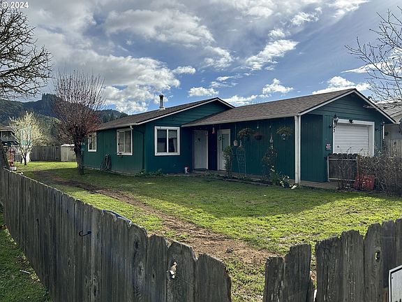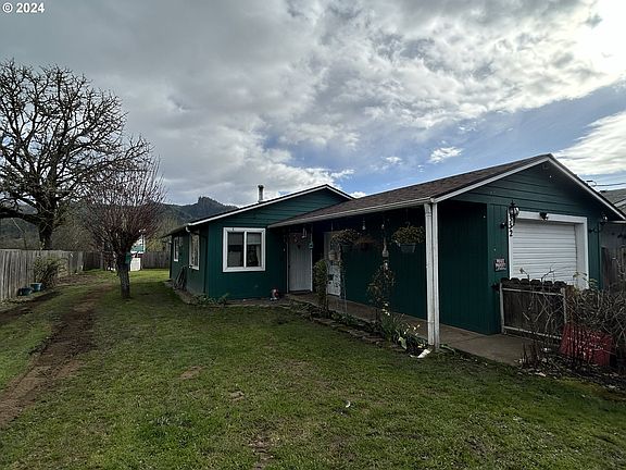 This charming home feels comfortable from the moment you step in the front door. The primary bedroom is spacious, with plenty of room for a king sized bed. Featuring roofing that is only 1 year old, a brand new refrigerator, a newer range/oven and dishwasher, and carpeting that is 3 years old, this home is in move-in-ready condition. The roomy yard is fenced and includes a greenhouse, 2 storage sheds, and an elevated play house ready for your personal finishing touches. The playhouse was actually originally constructed to provide an great view of the rodeo grounds! The fenced yard includes thornless raspberries, apple , nectarine and plum trees, a grape vine , currents and an herb garden, not to mention roses and many other landscape plants. The city park is across the street and the Sutherlin Creek Greenbelt with its paved walking trail is behind the home, with access just down the street.