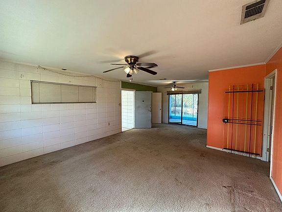 Two separate living areas could be a duplex. Two kitchens two baths. One side has three bedrooms. The other would be a studio set up. Huge, screened back porch overlooking a beautiful pond and storage building.
