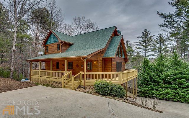 Filled with rustic charm, this mountain cabin features open concept living with stacked stone fireplace, cathedral ceilings, all wood interior, oversize windows, custom blinds, fully equipped kitchen with granite counters, stone accent island, whole-house generator, pantry and large dining area/sunroom. Stunning master suite with palladium window, separate Jacuzzi tub and walk in shower. (Guest bath also has Jacuzzi) 3 levels of covered porches; drive under garage. Seasonal mountain VIEW! Located on 1.8 acres in mountain community between Ellijay and Blue Ridge with all paved roads. Near National Forest w/hiking, biking and the beautiful array of colors through the changing of the seasons. Hurry, this one won't last long!