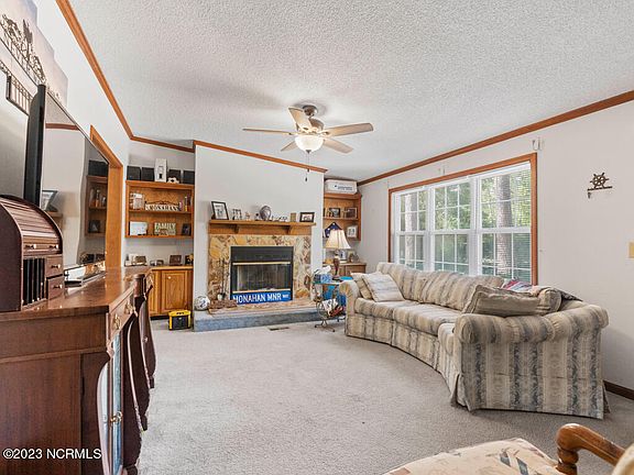 Welcome home to 352 Ridgewood Drive in Calabash, NC. This 3BDR/2BA double wide manufactured home, on a deeded lot in the Ocean Forest neighborhood, is For Sale. The DWMH features a large living room with a stone fireplace that creates a warm and inviting atmosphere. There is a spacious eat-in kitchen, that offers plenty of counter space, cabinets, and a pantry. The kitchen allows for casual dining with room for a table and chairs. There is also a large formal dining area adjacent to the kitchen, perfect for larger gatherings. The property has three large bedrooms with a split floor plan, ensuring privacy for both the owner's suite and guest bedrooms. The owner's suite features a bathroom with a dual vanity and a walk-in shower, providing comfort and convenience. A large private deck at the back of the house offers a great outdoor space for relaxation and enjoyment. There is also a storage shed in the backyard for beach and lawn items. Right off of the dining room are glass sliding doors, for easy access to the rear deck, allowing seamless indoor-outdoor living. There are skylights, crown molding, built-in cabinetry in the living room, ceiling fans, paved road, and a circular driveway for easy access and ample off-street parking. Ocean Forest is a tree-lined community, providing a serene and peaceful setting. It is conveniently connected to county water and offers the option for sewer access for an additional fee. Ocean Forest is located between Wilmington and Myrtle Beach, making it convenient for residents to enjoy various amenities, including beaches, golf courses, shopping centers, and restaurants. It's also close to the Town of Calabash, known as 'The Seafood Capital of the World.' This property offers a perfect blend of comfort, convenience, and natural beauty, making it an attractive option for retirees, beach lovers, or anyone seeking a coastal retreat. Call today!