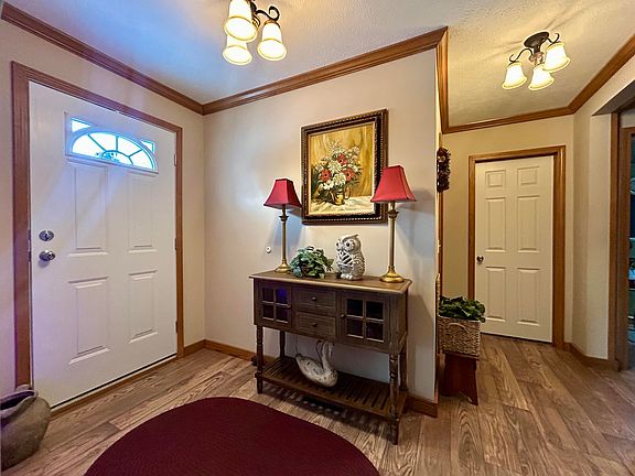 Inside, discover laminate flooring flowing seamlessly throughout, creating a cohesive and easy-to-maintain living space. Your eyes will be drawn upward to the elegant crown molding that adds a touch of sophistication, while warm oak baseboards provide a classic finish that frames each room beautifully. The heart of this home is undoubtedly the kitchen, where a centrally located island with a butcher block top awaits your culinary creativity. You'll appreciate the abundant storage and generous counter space, complemented by a propane stove that serious cooks will love.