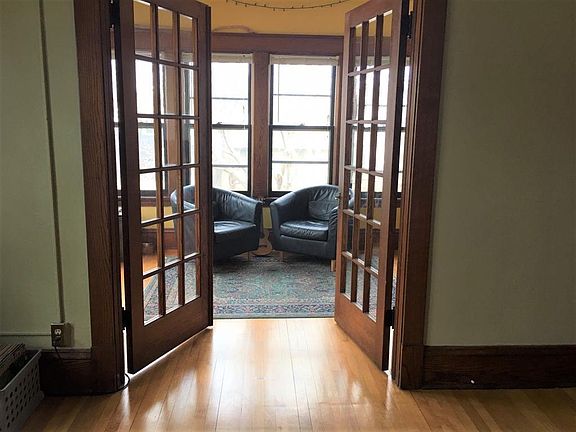 Vintage charm in a 2 BR condo updated w/ granite and stainless. Wood floors, built-in-buffet, French doors open sunroom w/ east, south, north light. Free laundry and storage in basement and off street parking, privacy fenced backyard w/ shared patio.