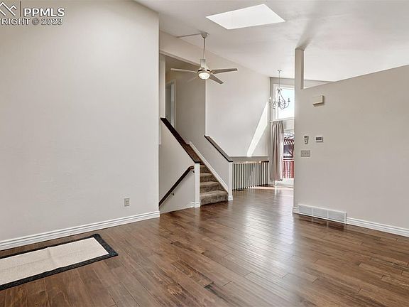 Updated home backing to Cottonwood open space, offering mountain views, comfort, convenience & modern finishes throughout. Located on a quiet street in the desirable Woodland Hills area w/easy access to restaurants, shopping, entertainment, parks/trails, D20 schools & main roads. New professionally painted exterior & trim. Newer front door invites you in. As you enter luxury plank engineered wood floors greet you & flow throughout the entire main & lower level. The great room boasts vaulted ceilings, skylight, & large windows letting the natural light pour in illuminating the open space. The dining area has modern chandelier, upgraded wrought iron railing, walk-out access to deck & opens to the gourmet kitchen creating the perfect layout to entertain friends & family. The kitchen has newer shaker style cabinets w/brushed nickel hardware, & stainless-steel appliances. Just down a few steps is the walk-out family room with custom built-ins w/ glass cabinets & crown molding, gas fireplace w/ beautiful tile surround & wood mantle. From here step out to the landscaped backyard offering large covered concrete patio or the elevated deck capturing Pikes Peak views. The yard has firepit, raised garden beds, level grass area, & gate w/access to the Cottonwood trail/park/open space. Back inside the upper lvl primary suite has great views, dual closets & private full bath boasting a skylight, custom mirror, modern vanity, & shower w/decorative tile. 2 additional upper bedrooms have easy access to the updated hallway full bath featuring subway tile shower surround, laminate wood flooring, newer vanity/mirror. Highlights include lower lvl laundry room, flat driveway w/ extra space on the side, xeriscaped front yard, & more! See it today!