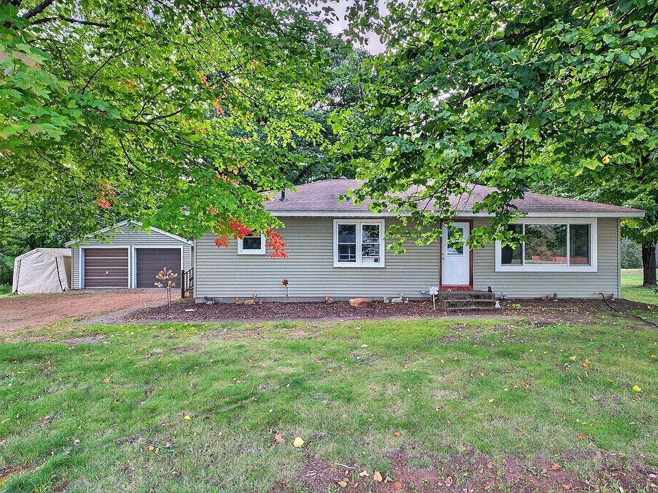Charming 3-bedroom, 1-bath ranch home with a 2-stall garage, situated outside city limits on 1.38 acres across two parcels. Just a stone?s throw from Homestead Golf Course & Supper Club, where you can enjoy a round of golf followed by a delicious meal! The property features mature trees and offers plenty of space for parking, recreation, or adding additional garage space. Inside, you?ll find hardwood floors in several rooms, including the spacious 21x13 living room, with more hardwood hidden under bedroom carpeting. Major updates provide peace of mind, including a furnace converted from fuel oil to natural gas approximately 5 years ago, a new drilled well and mound septic system installed at the time of the seller's purchase, new living room windows in 2024, and a recently upgraded 200-amp electrical panel. For those who prefer a more economical heating option, the basement also includes a functional wood-burning furnace, ideal for keeping the home cozy during winter months. The basement has already been improved with Sure-Dry wall bracing and a waterproofing system.,Seller is including the portable AC unit with the sale. According to seller, when furnace was replaced it was set up to add central AC -- a outside unit is just needed. This property combines the convenience of updated systems with the charm of a rural setting?ready for its next owner to make it their own.