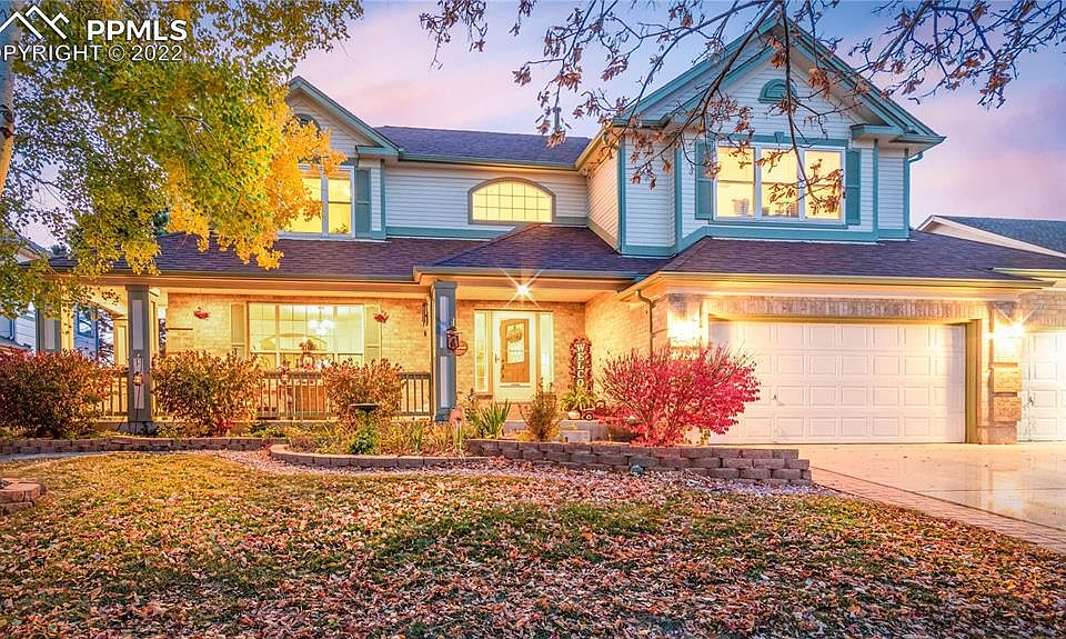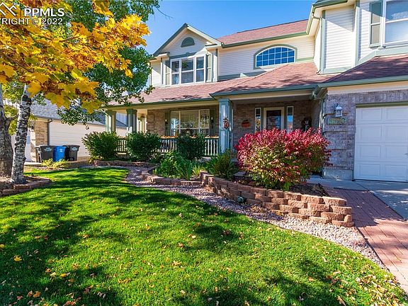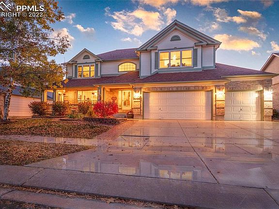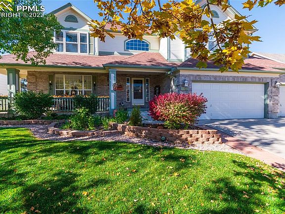 SPACIOUS 2 STORY HOME WITH STUNNING PIKES PEAK VIEWS AT A GREAT LOCATION! (aerial footage can be seen in the video tour) This well thought-out, nearly 4,600 sq.ft. floor plan offers distinctive living with custom finishes. a charming full length wrap-around front porch will welcome you home after a long day. Dramatic 2-story entry with curved staircase, and arched entry to the Living Room, complete with crown molding and arched entry to the Dining Room. The Dining Room is spacious enough for a full length table, and offers stunning views of Pikes Peak through the bay windows. The gourmet kitchen offers granite counters, spacious island with smooth cook-top range, stainless appliances, custom tray ceilings all the way into the Family Room. The kitchen is large enough to also be an eat-in kitchen, that steps out to the large back patio for convenient grilling. The FR is spacious an also offers mountain views, has a double sided fireplace, and custom tray ceilings. The other side of the fireplace leads to an office space with mountain views. The Master Bedroom is spacious and open with vaulted ceilings, has a convenient laundry shoot, and beveled glass french doors leading the Master Bath. The MB is spacious, 5 piece, with walk in closet. All the upper bedrooms are spacious. The 2nd upper bath offers a granite/quartz double vanity and is well lit with a sky light. The basement is spacious enough to accommodate a rec/game room area, a home theater setup, bath with shower, and massive 18x13 bedroom with walk-in closet. There is ample parking with the 3 car garage and driveway. You are just minutes from parks, Remington Elementary, and all that the Powers corridor has to offer.