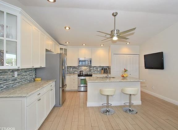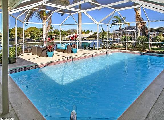 Beautifully remodeled (fully renovated in 2014 including new stainless whirlpool appliances, new Brother lighting fixtures and fans throughout, level 3 and 4 granite and marble in kitchen and baths) 3 Bed 2 Bath + Den gulf access home with spacious lanai with oversized pool overlooking gorgeous view of intersecting canals and basin with dock, lift and tiki hut. 20 minutes to river with one bridge. Panoramic waterfront views from home and lanai with a wide expanse of water to enjoy spectacular sunsets.