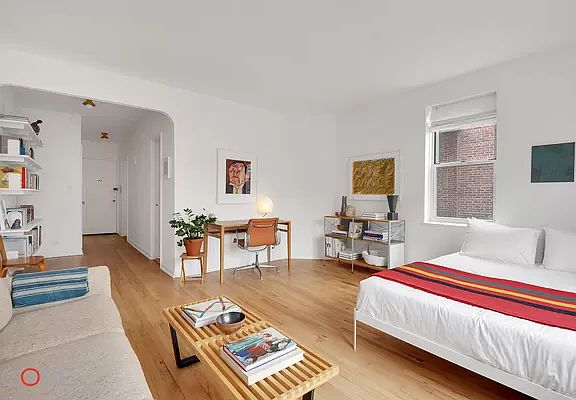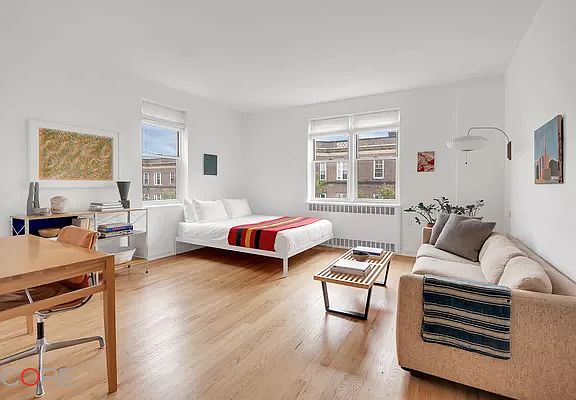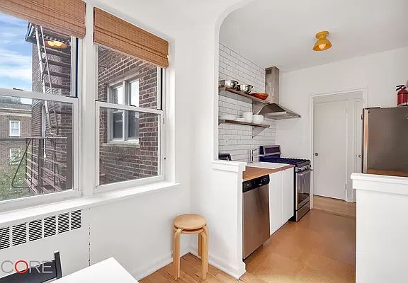 Wrapping south and west-facing corners on the fifth floor of the Monroe, this spacious and well-appointed studio offers beautifully refinished floors, a newly renovated windowed eat-in kitchen, a separate dressing room, ample closets, and more. Anchored by cork flooring, the kitchen is appointed with floor-to-ceiling subway tile, stainless steel shelving, sleek white lacquer cabinets, butcher block counters, a dishwasher, a complete line of stainless steel appliances, and has a spacious eating area, which can also double as a home office. Enjoying tree-lined block views and glorious sunsets. The living space is large enough to fit a bed and a separate entertaining area. An abundance of windows adds openness and depth to this home. The Monroe was erected in 1948 to the designs of William Hohauser. Superbly located on a quiet tree-lined street, moments to all amenities such as Travers Park and the green market, as well as a short distance from the Roosevelt transit hub, it offers amenities such as a private garden, bike storage, waitlisted rentable storage, recently updated elevators, laundry facilities, and a live-in super.