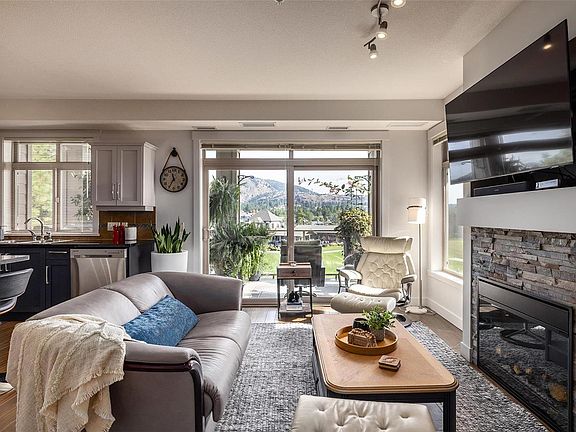 Incredible opportunity to live right on Two Eagles Golf Course in a beautiful and bright 2 bedroom 2 bath + flex space condo. This rare and exceptional floor plan offers a spacious open concept living area with access right from the main living area onto the large covered patio with golf course and mountain views. The electric fireplace in the living room creates a cozy ambiance for relaxing evenings by the fire. Gorgeous kitchen with shaker style cabinets, stainless steel appliances, granite countertops and a center island perfect for entertaining guests. The master bedroom is a peaceful retreat with a 5 piece en suite, walk-in closet and more views of the lush green surroundings. Spacious second bedroom with a 4 piece bathroom directly across the hallway. Additional flex space makes a convenient home office, TV room or home gym. This unit comes with 2 secure parking stalls and a storage locker.
