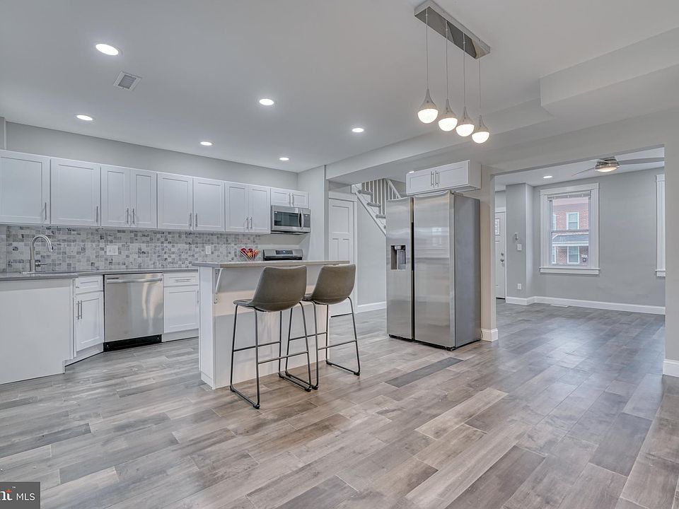 Elegant Renovation! Open Layout! All New Kitchen with Quartz Countertop and Coordinating Backsplash, Breakfast Bar Island, Stainless Appliances, and Wood Shaker Cabinets. Basement Suite with Family Room, Bedroom & Full Bathroom with Custom Tilework. The 2nd floor Dual-entry Full Bathroom features Stunning Calcatta Tile and Designer Plumbing Fixtures. New. HVAC System, Elegant New Wood Flooring, New Wall to Wall Carpeting, Modern Designer Lighting Fixtures, Recessed Lighting, New Doors, Replacement Windows, Front & Rear Porches. High Basement Ceiling. You Will Love This Home !