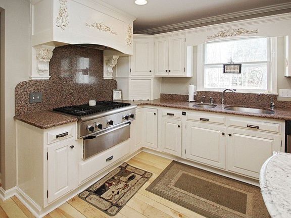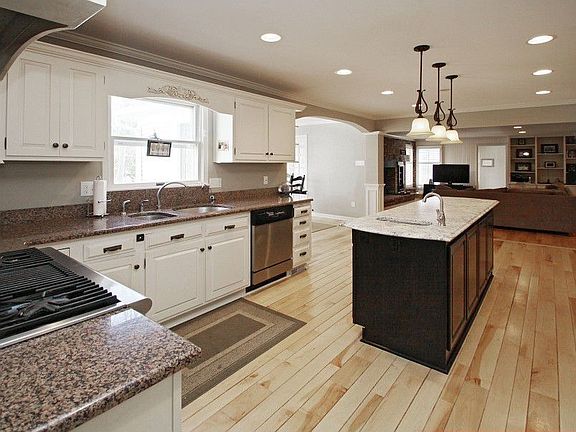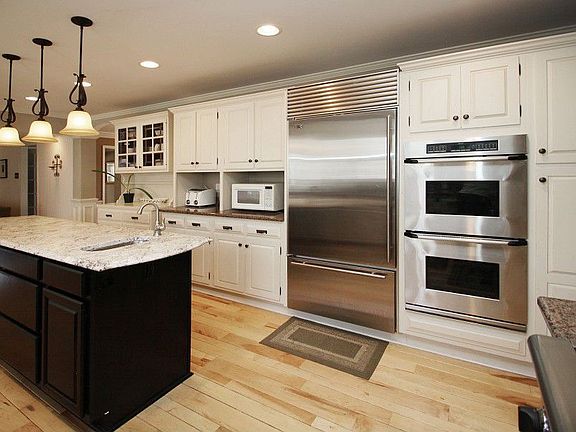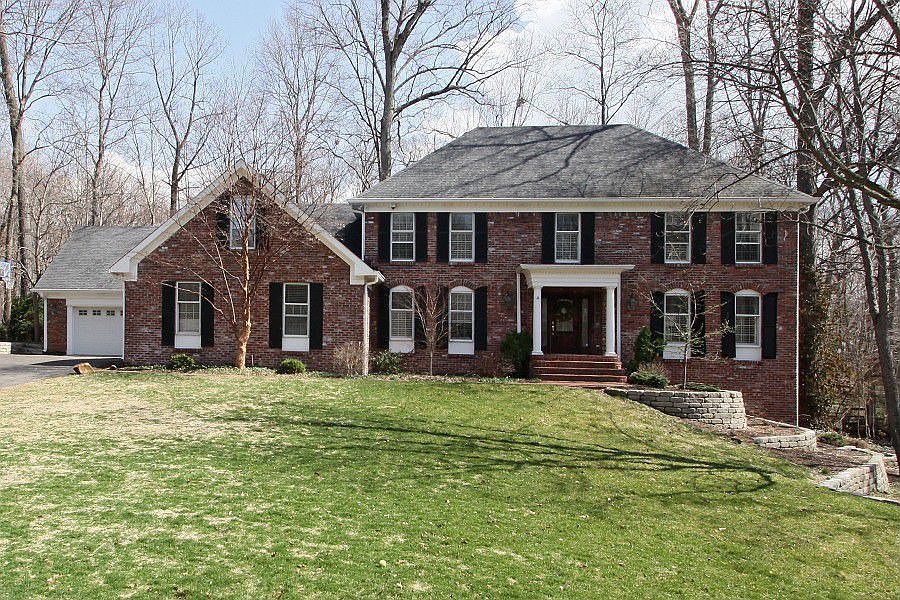 Stately Brick,updated Colonial w/brick entry on private wooded lot in the heart of Carmel.2 story entry. Newer upscale custom kit w/granite counter topes & stainless appliances, Gas cook top + warming oven + double ovens , ceramic tile floor in kit - Large plank maple hdwds in LR & DR, oversize Brick Hearth Fplc in Fam Rm-Liv Rm features 2nd Fplc. Sunroom w/skylights opens from breakfast room and overlooks beautiful wooded grounds-update d bath in master suite-walk-out lower level w/5th BR and f