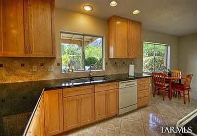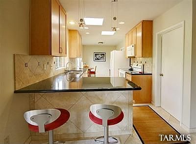 Foothills Clusters is the best-kept secret of affordable living in North Tucson! Incredible views of the mountains. District 16. Kitchen boasts of Black Galaxy Granite counters, new cabinets, custom tile back splash. 18 inch diagonal travertine in living areas and baths. Mexican tiled bathrooms, Completely remodeled. Ball and Ball fixtures, workshop. 2023-New exterior paint; 2022-Pebbletec pool & Kool Deck; 2021-Pavers. Extensive landscaping and pride of ownership thru-out.