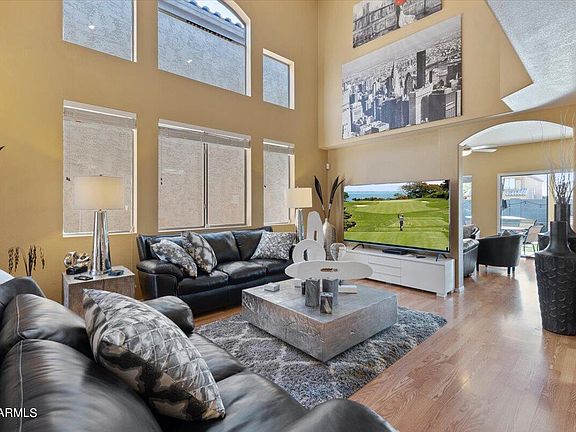 GATED STETSON HILLS. Step inside to soaring two story ceilings, sunlit clerestory windows and designer finishes. Ready for a cooking episode, the remodeled island kitchen has granite counters, an eat-at bar and stainless appliances. All bedrooms nestled upstairs for easy downstairs entertaining. Double walk-in closets in the primary suite. Upstairs loft could be anything. The bookworm will love the bay window. Handsome wood-look flooring dress the floors. No carpet anywhere. A peaceful getaway, the yard offers low maintenance synthetic grass and covered dining patio. Built-in garage cabinetry. Community pool/spa. Spectacular lot with no neighbors behind you. Bonus solar panels. Sought-after location near dining, entertaining, mountain trails and Valley freeways. Amenities