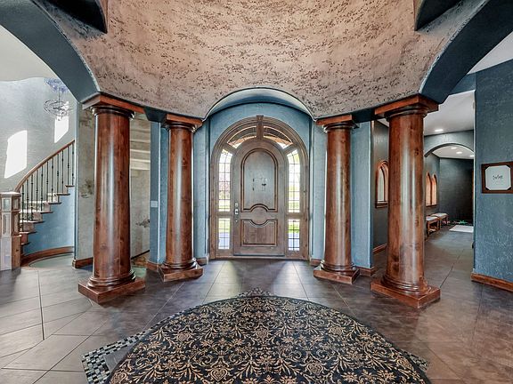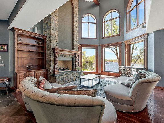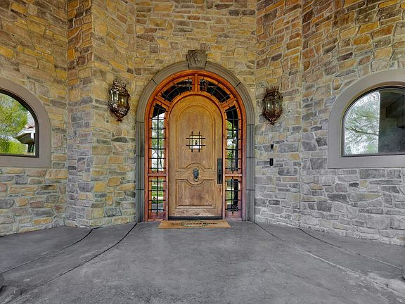 It's no exaggeration to call this magnificent waterfront abode a modern-day castle. Set on a cul-de-sac, in spectacular natural surroundings, it offers over 10,000 sq ft of living space on ¾ acre, including 6 bedrooms and 7+ baths. A gated entry leads to the ornate front door, framed by columns, arches, and stonework that preview the very high standard of design you'll find within. Notice the amazing fit and finishes everywhere you look with only the finest craftsmanship and materials on display. In nearly every room in the residence, you'll have relaxing, uninterrupted vistas of Crystal Lake. The tiled foyer introduces Mediterranean touches such as curved stairways with custom ironwork railings and distinctive wall finishes. It's all showcased by natural light flowing through windows positioned both high and low to take maximum advantage of the views outside. The living and dining rooms are arranged in a free-flowing open-plan layout that's ideal for entertaining with hardwood-style flooring and a dramatic fireplace. Steps away, there's a kitchen fit for the most accomplished chef, complete with granite countertop space on an oversize island, state-of-the-art appliances, a highly-polished floor, roomy cabinets, and abundant pantry capacity. Nearby, the carpeted den has a fireplace, built-in shelving, and dramatic dark crown molding. A main floor bedroom boasts deck access, built in cabinets, private full bath and a gas fireplace. As you might expect in a lavish home such as this, the primary bedroom is a stunning personal retreat. Under its dramatic tray ceiling, you'll have lush carpet, a raised platform for relaxed viewing through multiple windows, and access to a curved balcony overlooking the water. One of the two saunas in this residence highlights your ensuite bath, which also has an enclosed tub, deep walk-in closet and washer/dryer hook up. All accompanied by three additional bedrooms upstairs that come with their own ensuite as well. This home's expansive finished basement is the perfect "man-cave" with a bar, fireplace, plenty of flexibility for games, media theater, working out, or whatever else you desire. The 6th bedroom/bonus room includes a spacious sauna, full bath, pool changing room and 2nd shower. Be sure not to miss the hidden room, stained concrete floors and concrete safe room/wine room. Ground-level access to the pool/lake ensures perfect outdoor living and entertaining! There's a very long list of additional benefits for your consideration, including attached garage parking for twelve vehicles, a hobby/craft room, an office, a swimming pool, dock, fire pit, and crystal chandeliers. You and your guests can spend countless hours enjoying boating, canoeing, kayaking, and observing the wildlife that abounds in this serene, private, and tranquil setting. But why just read about it, when you can experience it all for yourself? This is a superior lifestyle that most people only dream of, so come take advantage of this impeccable private estate now!