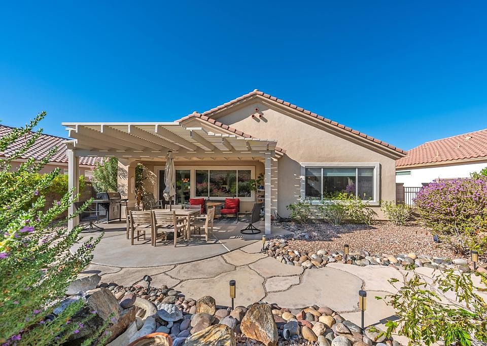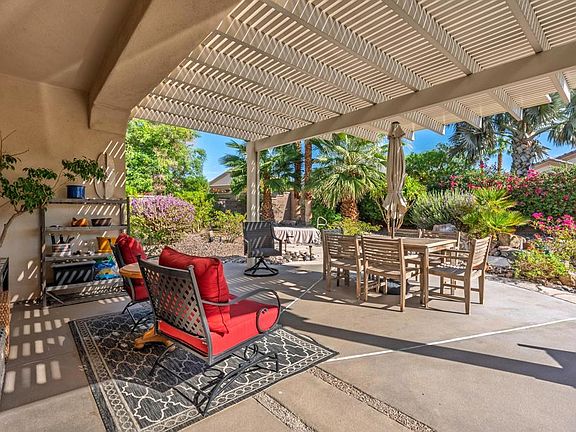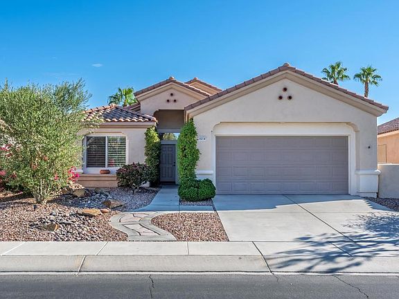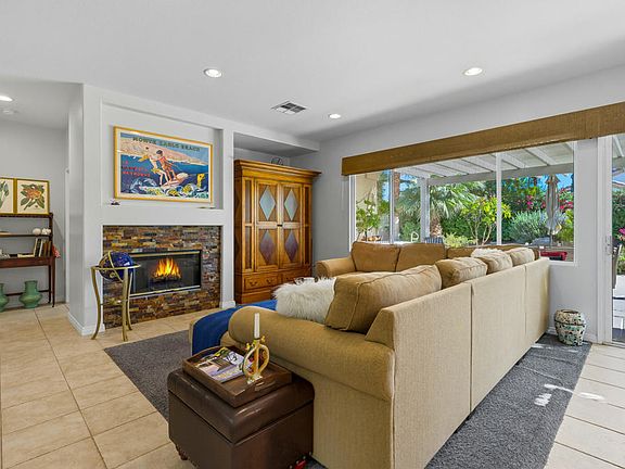 Sun City Palm Desert - St. Maarten. Located near two clubhouses and in the newest section of Sun City, this popular St. Maarten greatroom floor plan offers 2 bedrooms, 2 bathrooms, and a versatile den/office. One of the home's standout features is its spacious, north-facing rear yard situated on a large lot -- beautifully landscaped and designed for outdoor living with an extended decorative concrete patio, alumawood patio cover, and a sunken hot tub and fountain. Inside, the home is bright and open with abundant natural light enhanced by Solatubes in the kitchen, foyer, and den. Tile flooring runs throughout the main living areas, and the greatroom features a gas fireplace with a stacked-stone surround and direct access to the patio. The kitchen is both stylish and functional with granite countertops, under-cabinet lighting, recipe windows, stainless steel appliances, a breakfast bar, pantry, and pull-out shelving in the maple cabinetry -- which extends to the bathrooms, laundry, and linen storage. Accordion doors off the greatroom open to a spacious den/office with plantation shutters. The primary suite includes a media nook, large walk-in closet, and en suite bathroom with a sitting vanity and glass-enclosed shower. The guest bedroom also offers a walk-in closet and shutters, and the guest bath features a tub/shower combination. Additional highlights include a laundry room with built-in storage, a two-car garage with ample storage space, and a new AC installed in 2021.