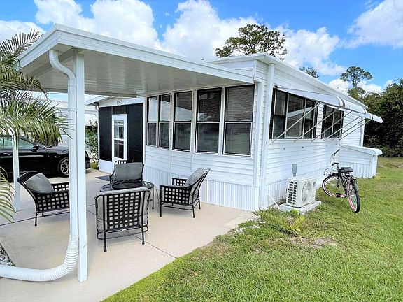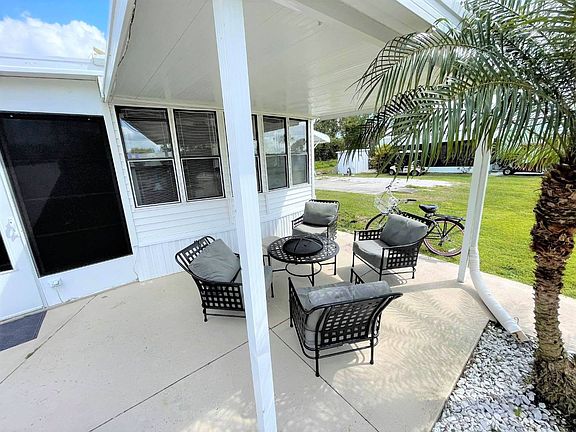1 Bed, 1 Bath fully furnished home. Insulated Florida Room, tiled with screens, blinds, and wall A/C unit. Main home is bright and roomy with a large sectional, lots of great storage and built-ins, nice kitchen with gas stove and bathroom with big shower. Good size bedroom with large closet. There are plenty of extras here! Updated flooring, kitchen, bathroom and much more. Storage room with washer and dryer. Front and rear covered patios. Brand new Mini Split A/C. Must see!