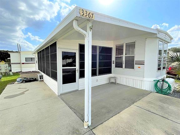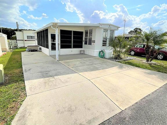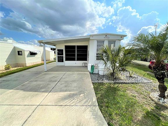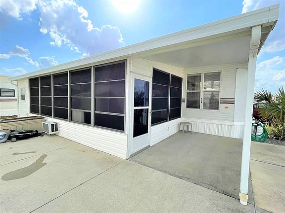 This is a great Winter Getaway! 40' long furnished 1 Bedroom 1 Bath home with new roof lots of storage in the kitchen and bedroom. Great layout for the those who have visitors with an extra room upfront. Extra room has a day bed that turns into queen and a sliding partition for privacy. Newer A/C in main home. An attached extra large Florida Room adds lots more living area and even has an extra storage room with washer and dryer. Double car driveway with front covered patio. Very well maintained!