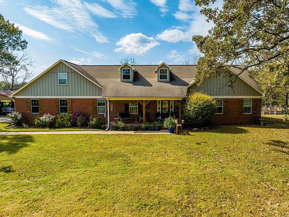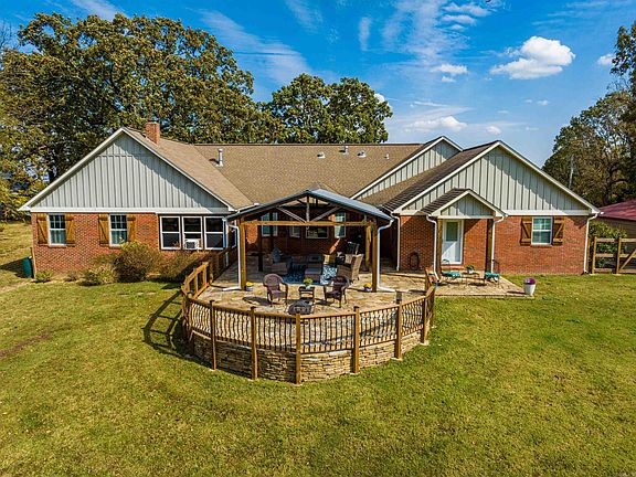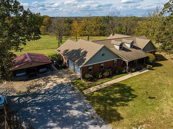 Nestled in the foothills of the Ozark Mountains and consists of 55 +/- rolling acres sitting on one of the highest hills in the county, which includes four ponds, all fenced and cross-fenced, ready for cattle, sheep, or goats, which will make this a beautiful Hobby Farm.The main residence is about 5,050 +/-sq ft under the roof and 3312 +/- sq ft heated and cooled, with 1230 +/- sq ft in the unfinished basement and 524 +/- sq ft in the garage.The vented heat pump system keeps the basement at a year-round moderate temperature.Second residence is a beautiful 1580 +/- sq ft Clayton double-wide mobile home with a new custom-built deck off the back, a fenced yard, and a built-in dog house under the back deckA private drive leads to this secondary home off the main drive, making it ideal for guests, family, or a rental. As you enter the property through a beautiful custom security gate with a keypad or automatic clicker, you are greeted with an 800’ landscaped driveway with board fencing (only two years old) leading to the main residence that overlooks the whole property from the front and back of house and views across the countryside.See additional information AND Floorplan!