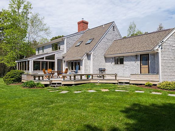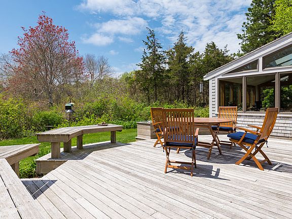 Situated down a long driveway on a wonderful private 5+ acre lot, this home is just a short walk to the village, beach, and marina. Featuring an open floor plan and a first floor master suite with sliders to the patio. The lovely dining room has beamed ceilings and a wall of windows, living room with fireplace, and wood floors are throughout most of first floor. In addition, there is a year round sunroom with a brick floor. The second floor offers two additional bedrooms and an open loft area, perfect for a home office or library. The attached two car garage has stairs that lead to unfinished space offering even more potential. You will never want to leave this private oasis where privacy and nature abound.