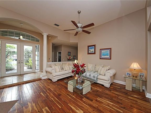 Location! Location! Location! Stunning executive pool home at the end of a quiet cul-de-sac, backing to River Hills Country Club's 12th and 17th fairways. This gorgeous home boasts extensive travertine and hand scraped wood floors, volume ceilings, designer lighting and fans, plantation shutters and a wonderful split-bedroom floor plan featuring formal entry, living and dining, kitchen with breakfast nook, spacious family room, five bedrooms (one serving as a study), four full baths and laundry with cabinetry, washer and dryer. The kitchen has granite countertops, wood cabinetry with 42" uppers, center island, stainless appliances, breakfast nook looking out onto the pool deck, and breakfast bar overlooking the family room with fully recessing sliding doors to the lanai. In front, you'll find professional landscaping, pavered driveway leading to the oversized three-car garage, pavered side walkway and pavered front walkway leading to the covered double-door entry. In back, your outdoor oasis awaits, with travertine patio and pool deck, covered area for lounging, heated Pebble Tec pool and spa, and spectacular golf-course views. River Hills is a prestigious community with 24/7 gated entry, tree-lined streets, playgrounds; and golf and country club with 18-hole course, Junior Olympic pool, Har-Tru tennis courts, dining room, sports bar, pro shops and fitness center. Shopping, dining Montessori school, day care center and top-rated schools are nearby. With a new roof in July 2016, this home is move-in-ready!