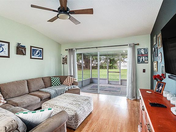 Maintenance-Free Living in The Manors at Lake Bernadette! This charming villa is move-in ready and full of potential. Step into the screened front porch—perfect for morning coffee—before entering the spacious 18x8 eat-in kitchen, offering generous counter space, ample cabinetry, and a versatile broom/coat closet that could double as a pantry. Just off the kitchen is a 10x8 dining room with plenty of space for a hutch or buffet. The bright and open 16x13 living room features a large sliding glass door that fills the space with natural light and opens to the rear screened porch—ideal for relaxing or entertaining while enjoying peaceful backyard views. The 15x12 primary suite includes a walk-in closet, dual sinks, a makeup vanity, and a private linen closet. A split-bedroom layout offers privacy with the 12x10 secondary bedroom located at the front of the home, adjacent to a full bath and an additional linen closet. A convenient laundry closet sits in the hallway across from the one-car garage, which includes built-in shelving for extra storage. The home has been well cared for, with a new water heater installed in 2025 and the AC replaced in 2018. Buyers may wish to add their personal touch with minor cosmetic updates, but the home is in great shape and ready for immediate enjoyment. Enjoy a low-maintenance lifestyle with HOA fees that cover lawn care, exterior painting, roof replacement, trash pickup, and access to fantastic community amenities—two pools, a clubhouse, tennis and basketball courts, a playground, fitness center, and more! Don’t miss this opportunity to enjoy sunny Florida living and make this home your own!